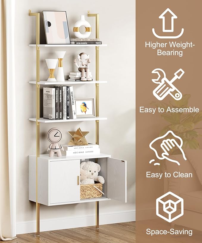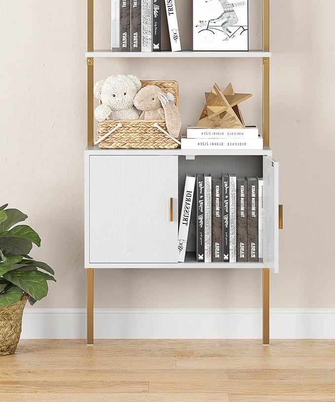 Gadroad Ladder Bookshef with Cabinet, Wall Mounted Bookcases, 5 Tier Tall Open Display Rack, 73" Metal Industrial Bookshelf, Storage Shelves for Livingroom, Home Office, Gold