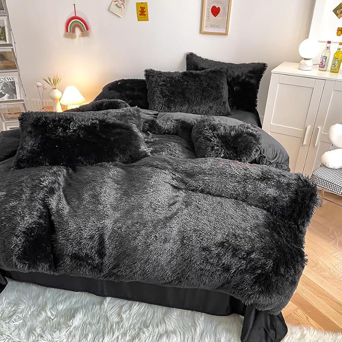 Faux Fur Kids Girls Black Comforter Sets King - 3PC Bed Set Warm Comfortable Soft Plush Flannel Velvet Fluffy Fuzzy Bedding(Comforter x 1 Pillowcases x 2)