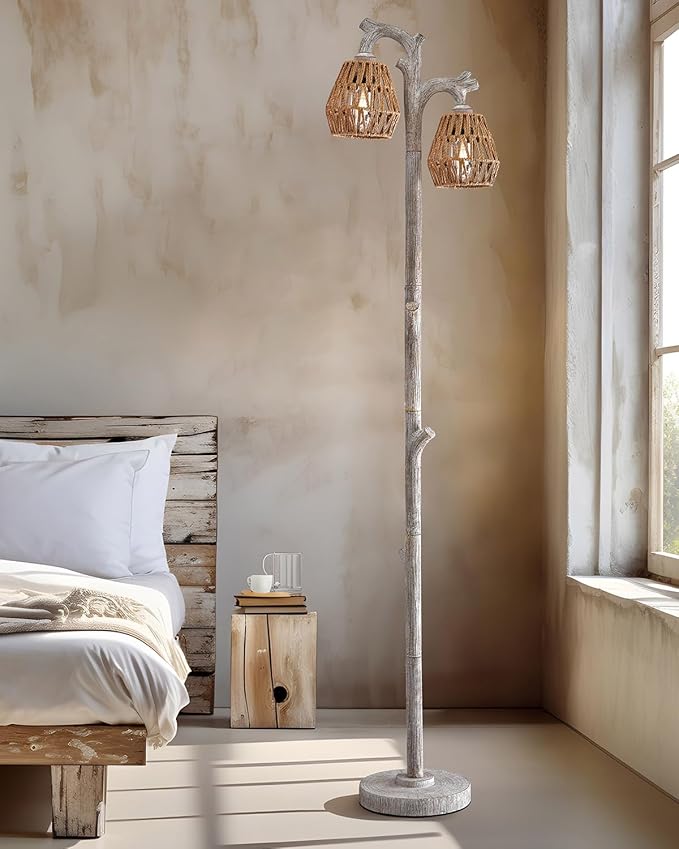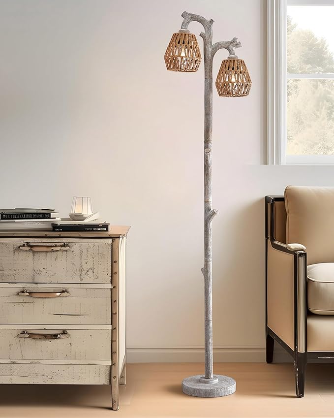 OYEARS Retro Farmhouse Rattan Floor Lamp Boho for Living Room Rustic Standing Lamps Tree Trunk Deco Modern Country Vintage Wood Grain 62" Tall Corner Floor Lamp Bedroom Office…