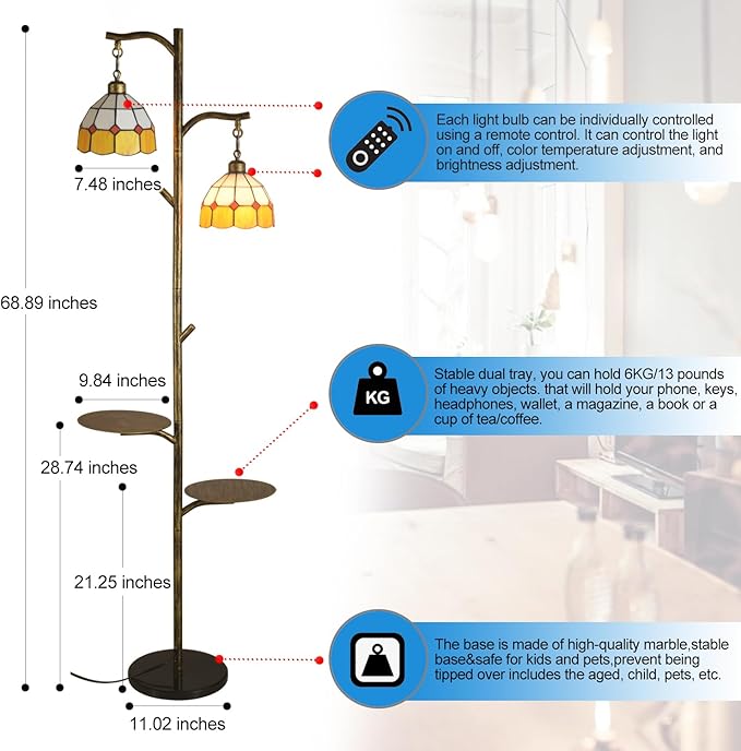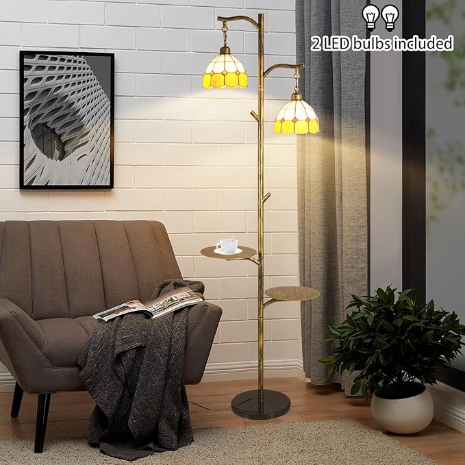 Tiffany Style Stained Glass Retro Floor Lamp with Tray,Dimmable Led Floor Lamps, Custom Color Temperature Standing Lamp with Remote for Living Room and Bedroom,Painted Bronze
