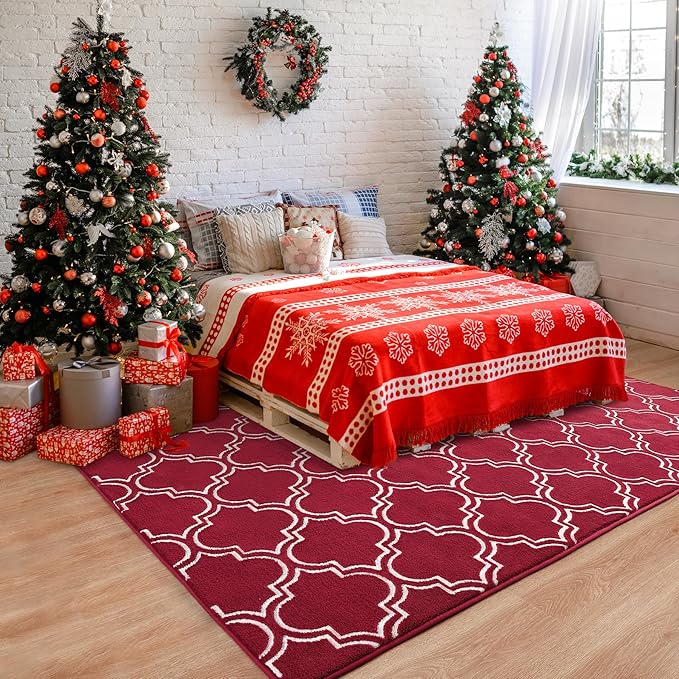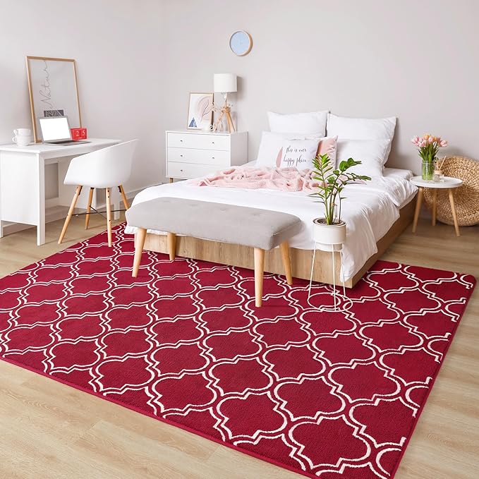 Chicrug Shag Geometric 4x6 Area Rug for Living Room, Large Modern Memory Foam Indoor Carpet, Fluffy Rug for Bedroom Bedside Room Decor for Family Girls Kids Nursery, Wine Red/White