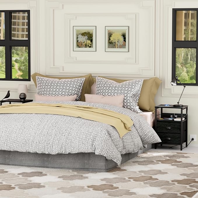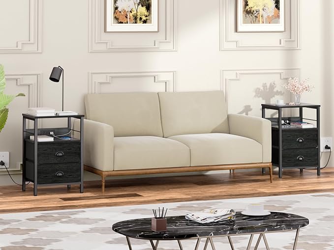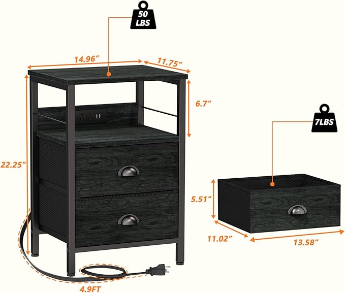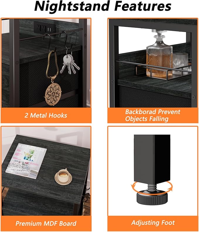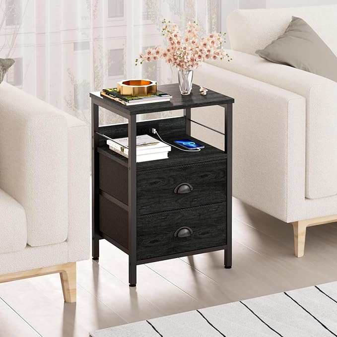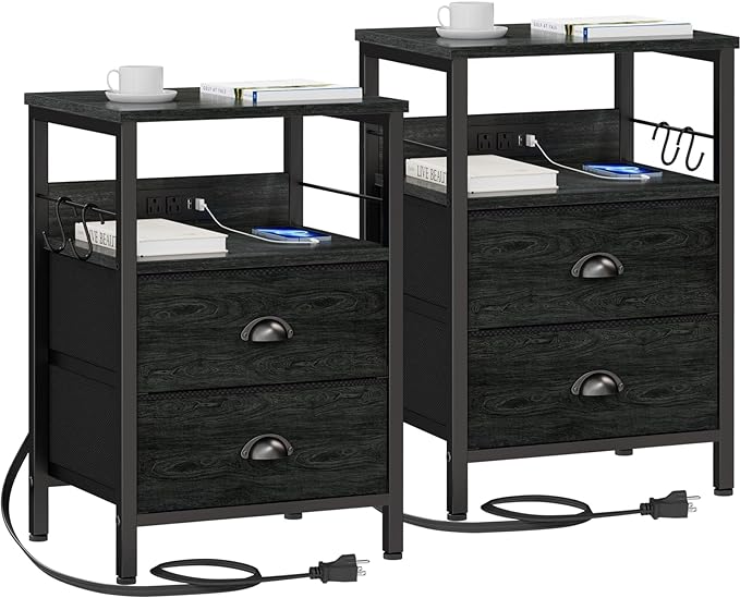 Furologee Nightstand Set of 2, Black Oak, with Charging Station and USB Ports, Side Tables with 2 Fabric Drawers, Bedside Tables with Storage Shelf & Hooks, for Living Room/Bedroom