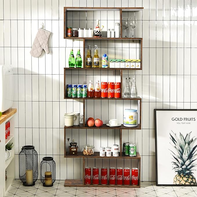 BETTARY 6-Tier Bookshelf, Freestanding S-Shaped Geometric Display Shelf, Modern Tall Bookcase for Home Office, Living Room, Bedroom, Coffee