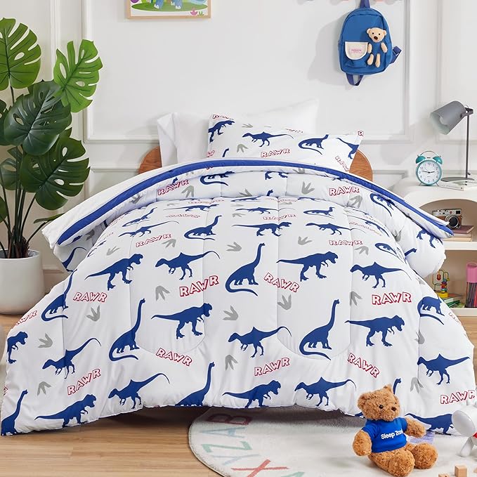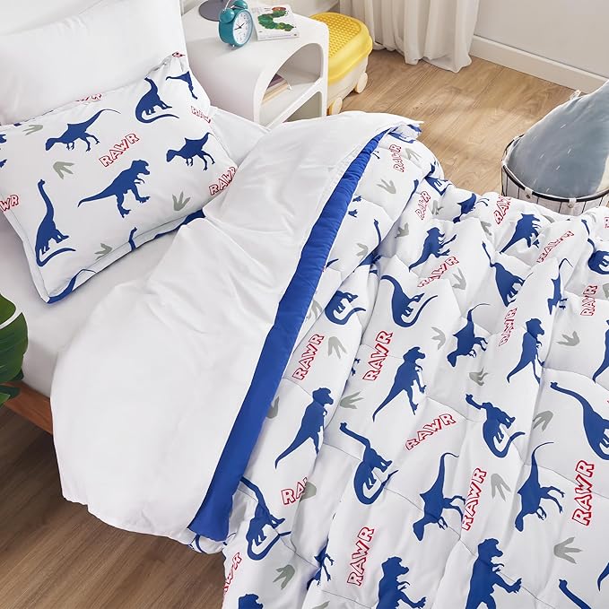 SLEEP ZONE Cartoon Dinosaur Comforter Set, Dark Blue Kids Bedding Set for Boys, Dinosaurs Print Comforter, Sheet, Pillowcase & Sham (Dinosaur Footprints, Twin)