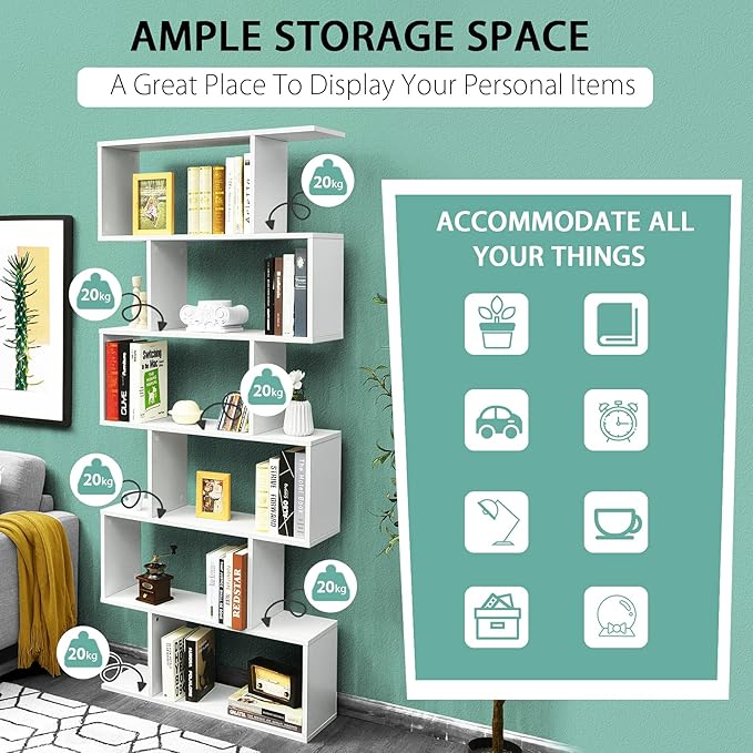BETTARY 6-Tier Bookshelf, Freestanding S-Shaped Geometric Display Shelf, Modern Tall Bookcase for Home Office, Living Room, Bedroom, White