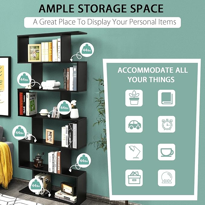 BETTARY 6-Tier Bookshelf, Freestanding S-Shaped Geometric Display Shelf, Modern Tall Bookcase for Home Office, Living Room, Bedroom, Black