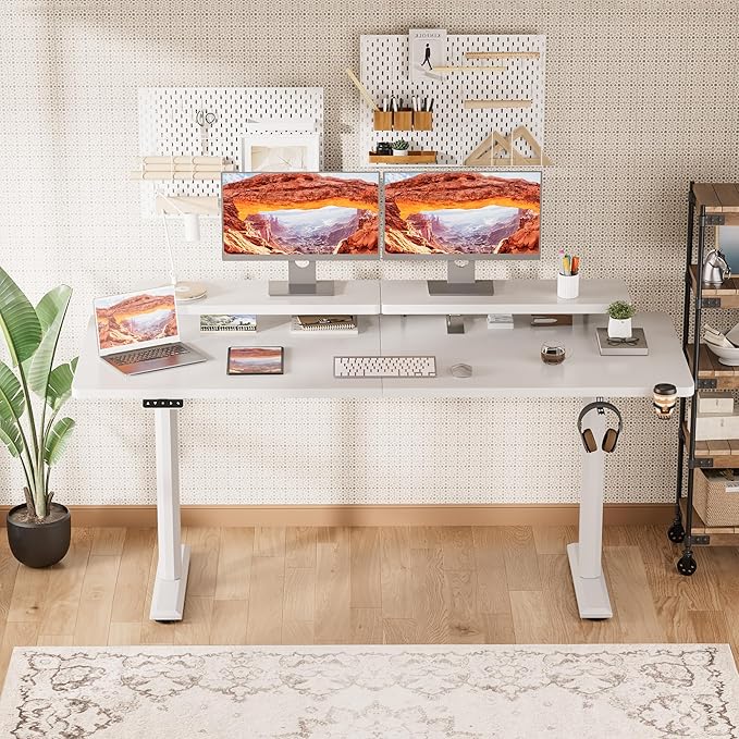 Electric Standing Desk with Monitor Shelf, 63 x 27 Inches Height Adjustable Corner Table, Computer Workstation with Cup Holder and Hook for Home Office, White, 63x27 Inch