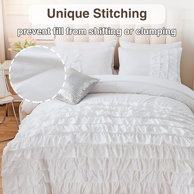 A Nice Night Waterfall Flutter Ruffle Comforter Set,Ruffled Textured Soft Chic Princess 6pcs Bedding Set,with Bling Shiny Sequin Throw Pillow Case,White,Full