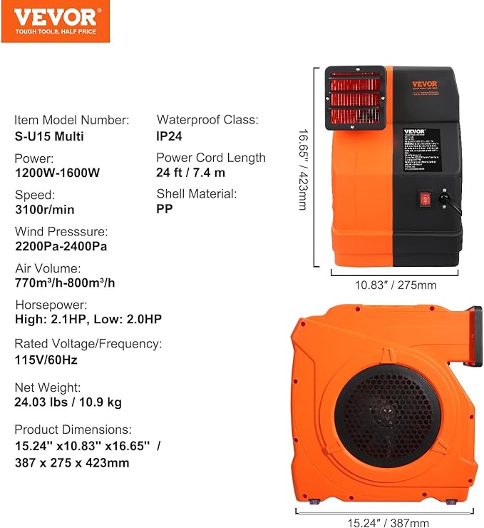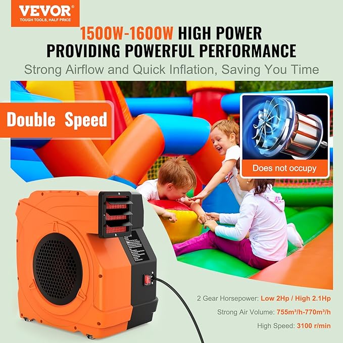 VEVOR Inflatable Blower, 1500W, 2 & 2.1 HP Bounce House Blower, Pump Commercial Air Blower for Inflatables, 3100 RPM Bouncy Castle Electric Fan Perfect for Bounce House