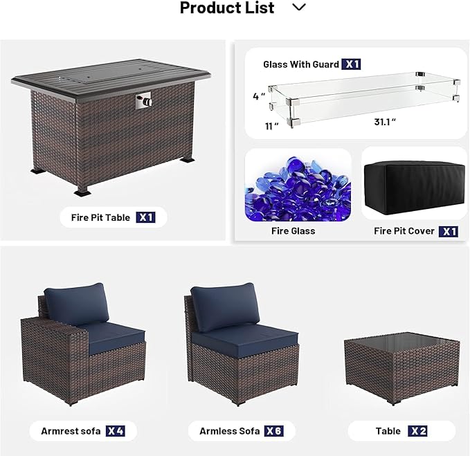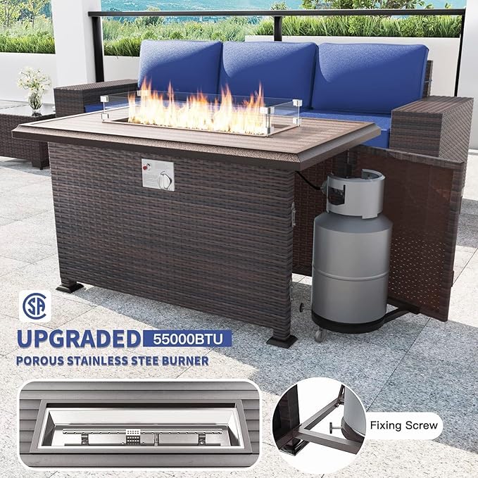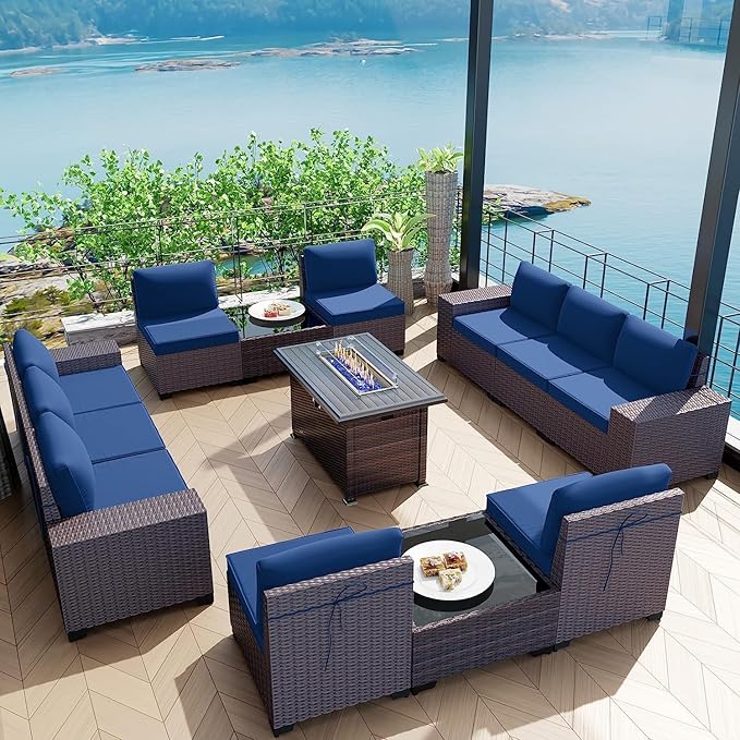 Kullavik 13 Pieces Outdoor Patio Furniture Set with 43" 55000BTU Gas Propane Fire Pit Table PE Wicker Rattan Sectional Sofa Patio Conversation Sets,Navy blue