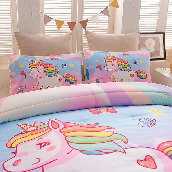 Aimuan Girls Unicorn Comforter Set 3 Pieces Pink Purple Bedding Set with Rainbow Star Galaxy Stars Fantasy Children Room Decor Soft Reversible Bed Sets for Boys/Girls/Teens (Pink Blue Twin3Pcs)