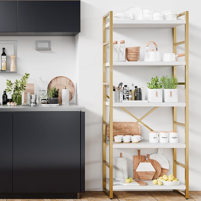 Shintenchi 5 Tiers Bookshelf, Classically Tall Bookcase Shelf, Industrial Book Rack, Modern Book Holder in Bedroom/Living Room/Home/Office, Storage Rack Shelves for Books/Movies,Gold