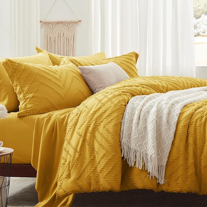 Anluoer Queen Comforter Set, Mustard Yellow Tufted Bed in a Bag 7 Pieces with sheets, All Season Bedding Sets with 1 Comforter, 2 PillowShams, 2 Pillowcases, 1 Flat Sheet, 1 Fitted Sheet