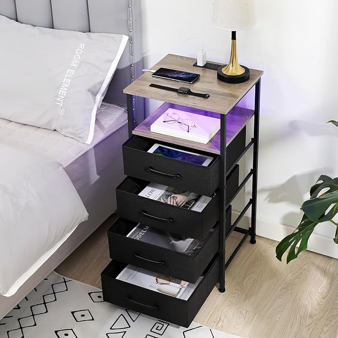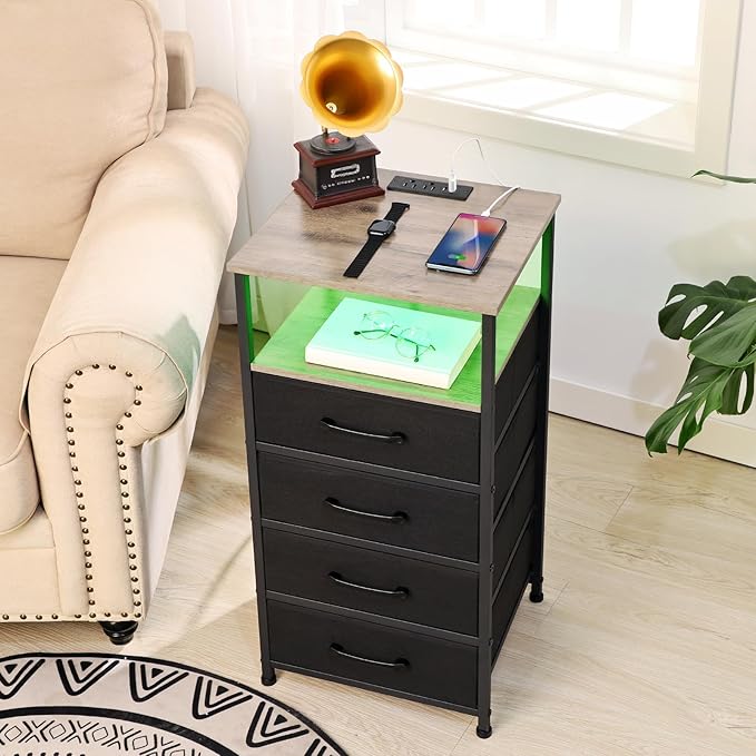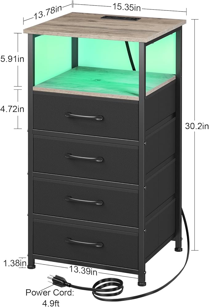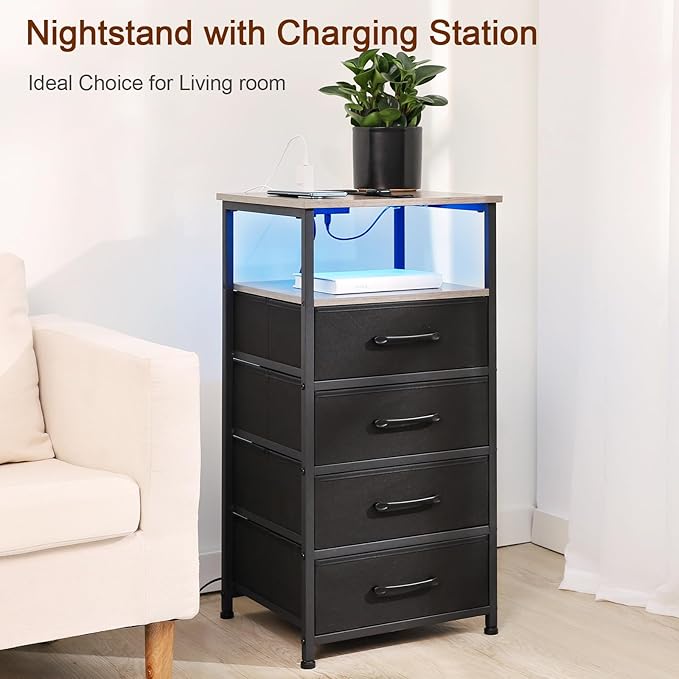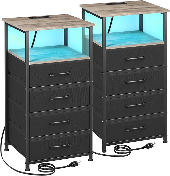 Nightstands Set of 2, Large End Tables Living Room, Bed Side Tables with Charging Station, 30" Tall Night Stand with 4 Fabric Drawers and LED Light Strip for Bedroom HNS014GY