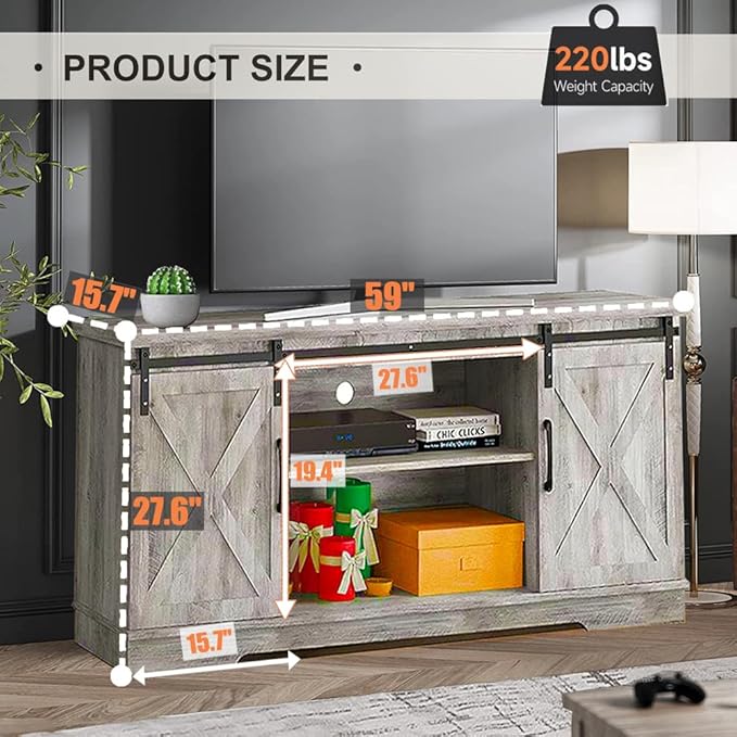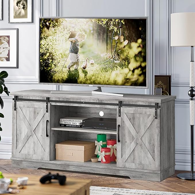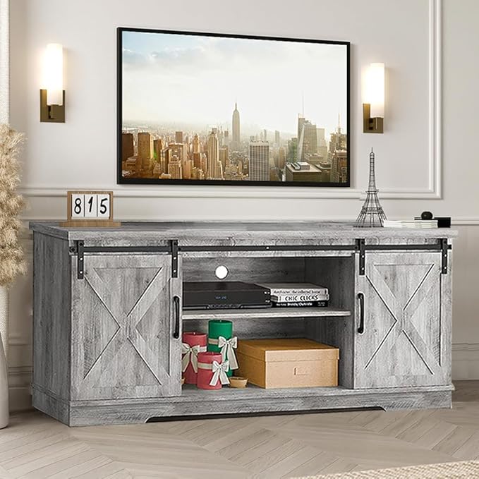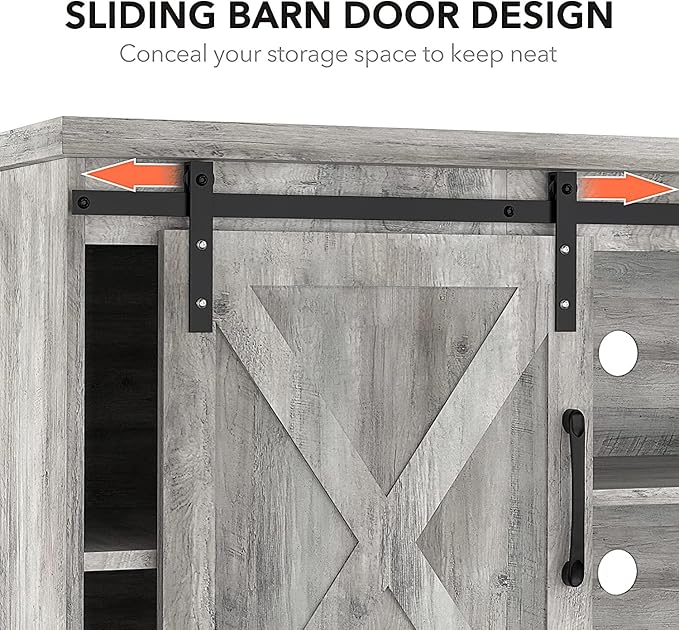 About This * FARMHOUSE CLASSIC DESIGN: This beautiful barn door TV stand with a grey wood grain finish adds a...