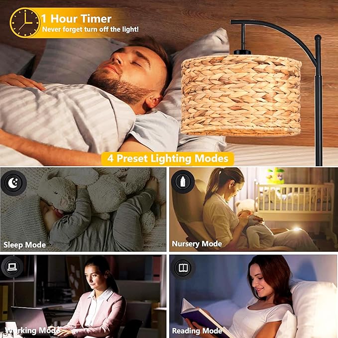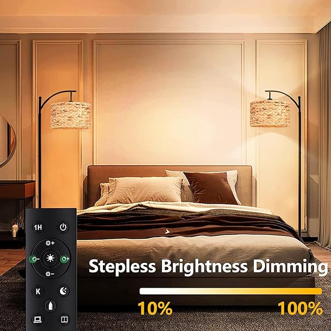 Floor Lamp for Living Room Bedroom Rattan Boho Arc Standing Lamp with Remote Dimmable Black Wicker Bamboo Lamp Shade Floor Light Adjustable Tall Lamp Farmhouse Industrial Floor Lamps Bohemian
