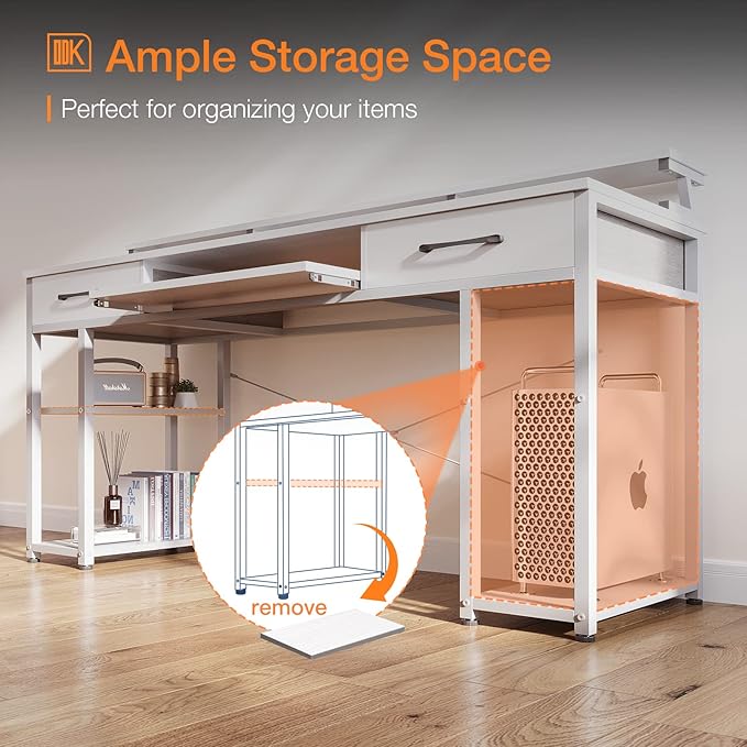 ODK Computer Desk with Drawers & Power Outlet, 63 Inch Office Desk with Keyboard Tray & Storage Shelves & PC Stand, Large Office Table Work Desk with Monitor Stand, White