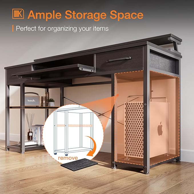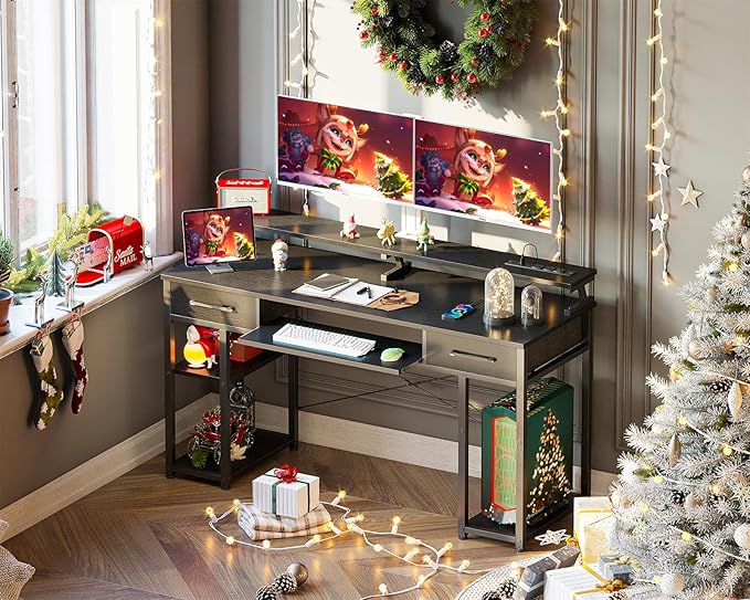 ODK Computer Desk with Drawers & Power Outlet, 55 Inch Office Desk with Keyboard Tray & Storage Shelves & PC Stand, Office Table Work Desk with Monitor Stand, Black