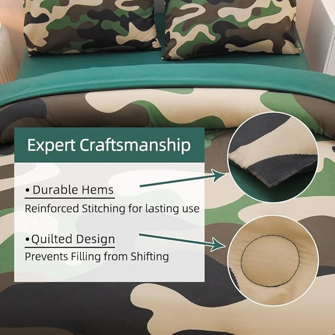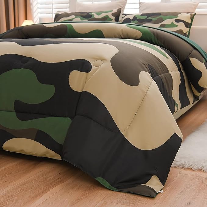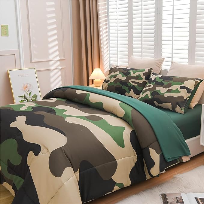 Meeting Story Camouflage Bedding Set, Colorful Pattern Style Comforter Set, 5 PCS One Comforter Two Pillowcases Two Sheets in One Bag, All Season Bedspread for Teens Adults (Green, Queen 5Pcs)