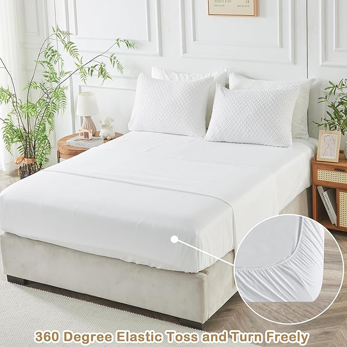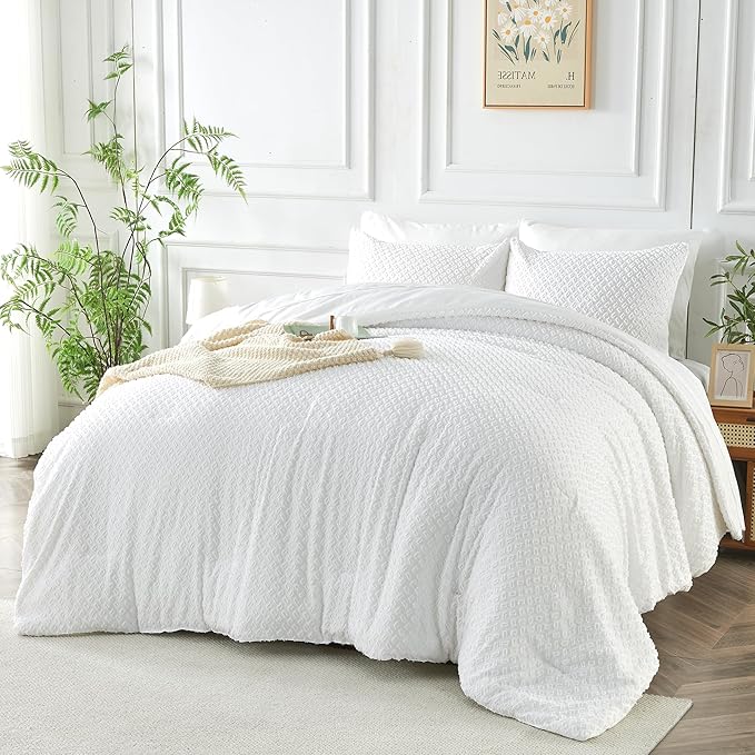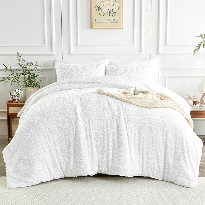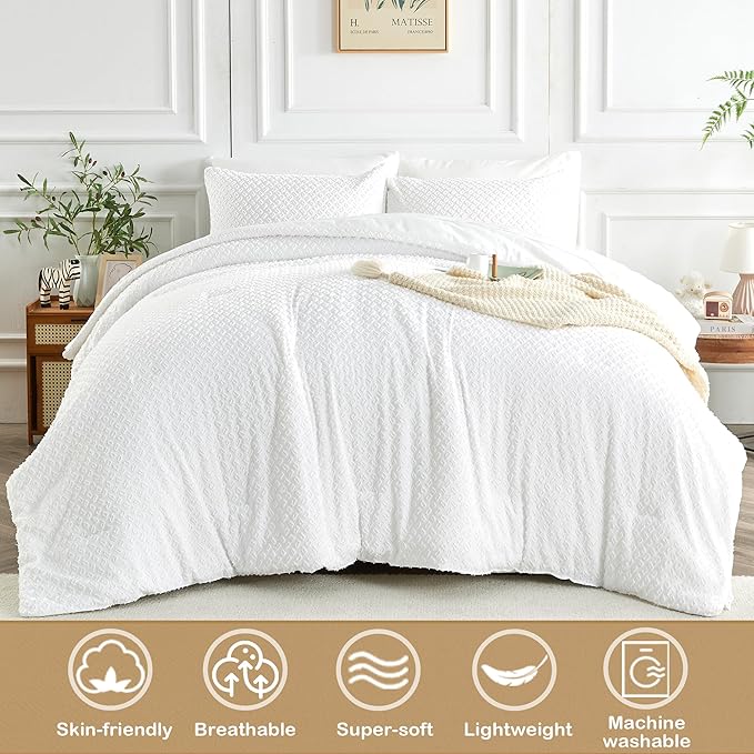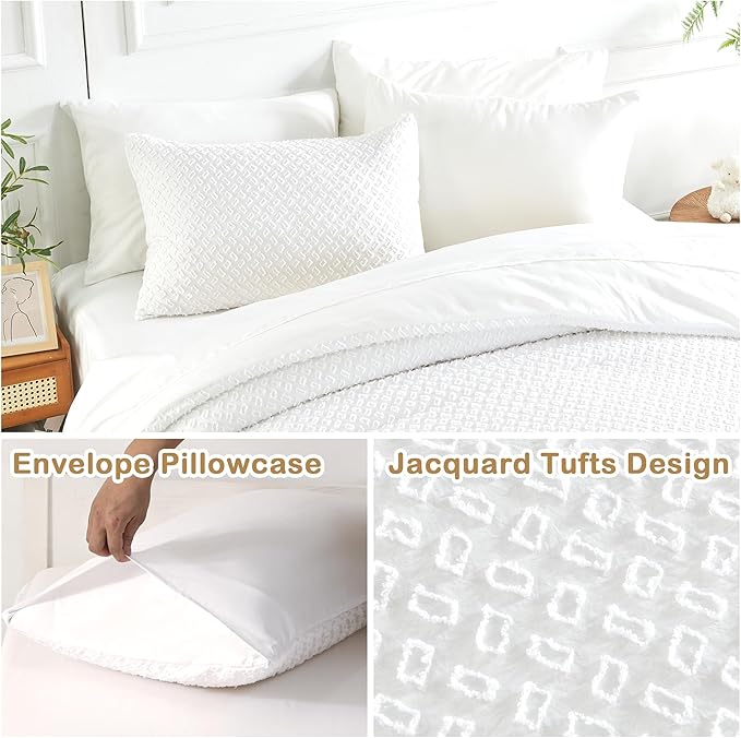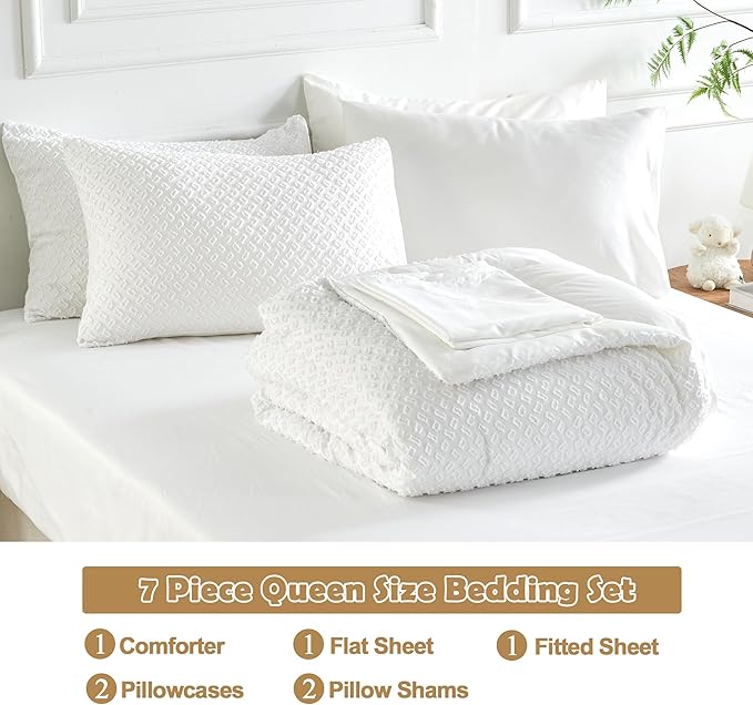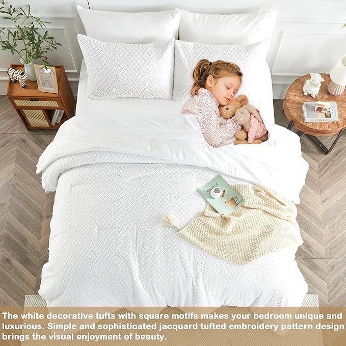 Queen Size Tufted Kids Comforter Set 7 Piece White Jacquard Tufts Embroidery Bedding Set for Boys Girls Bed in A Bag Quilt with 1 Comforter, 1 Flat Sheet, 1 Fitted Sheet, 2 Pillowcase, 2 Pillow Sham