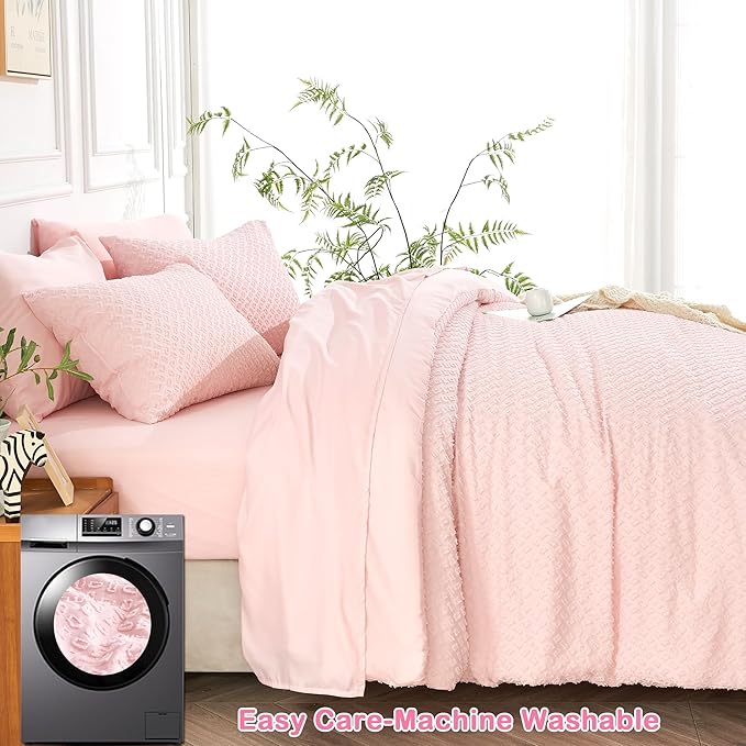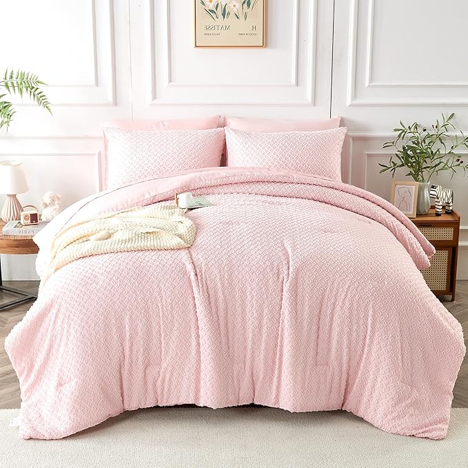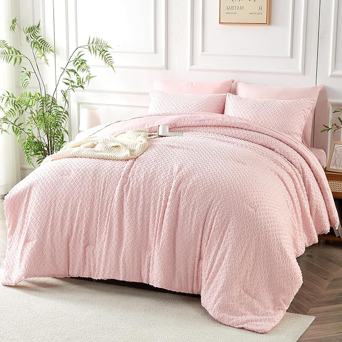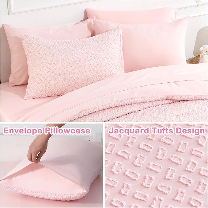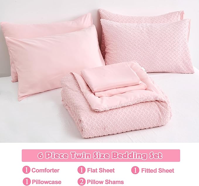 Twin Size Tufted Kids Comforter Set 6 Piece Pink Jacquard Tufts Embroidery Bedding Set for Girls Bed in A Bag Quilt with 1 Comforter, 1 Flat Sheet, 1 Fitted Sheet, 1 Pillowcase and 2 Pillow Sham