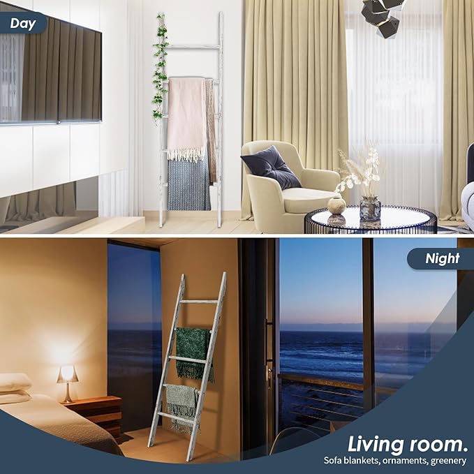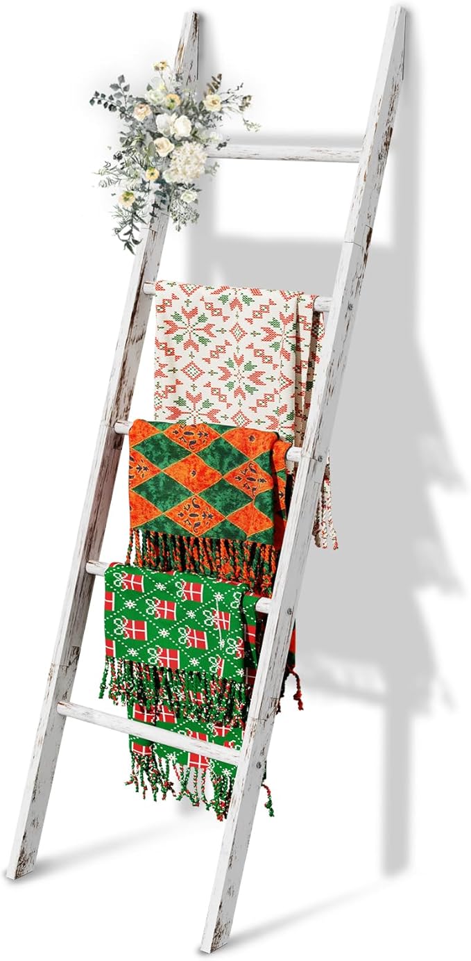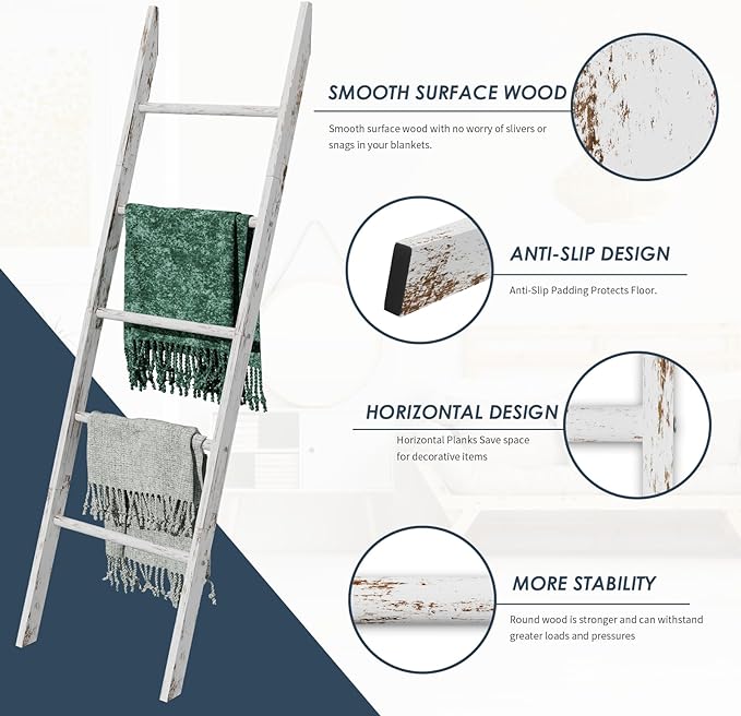5-Tier Blanket Ladder Wooden, 5.3FT(63'') Blanket Quilt Holder Rack Decorative Ladder, Easy Assembly, Rustic Farmhouse Ladder Shelf for The Living Room Bedroom Bathroom Home Decor, White Wash