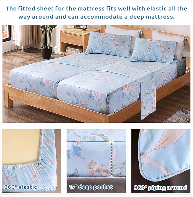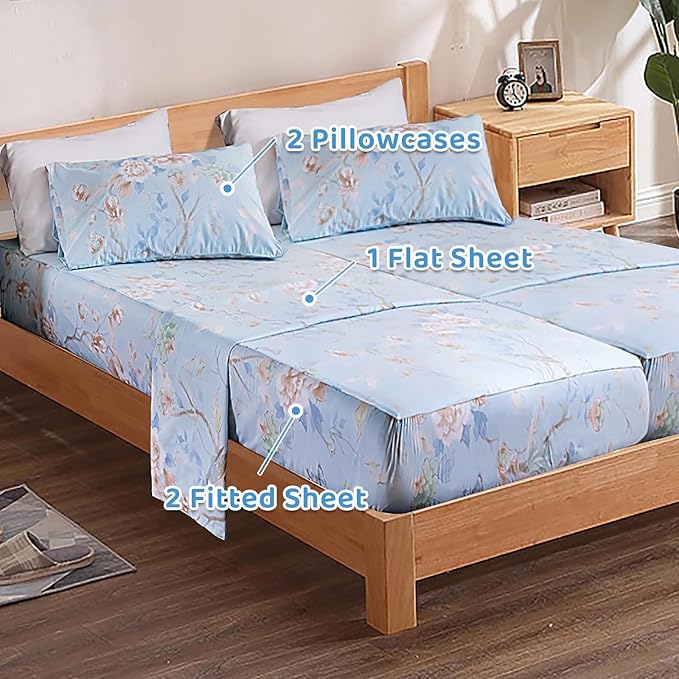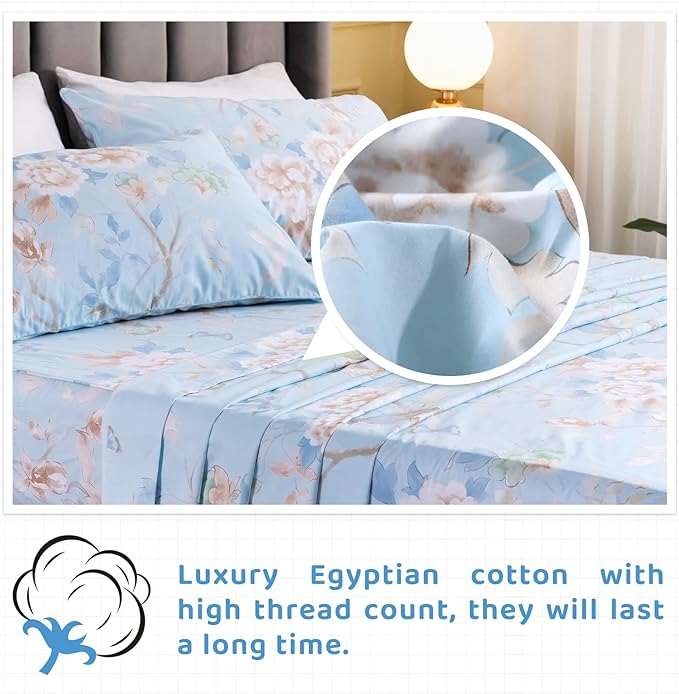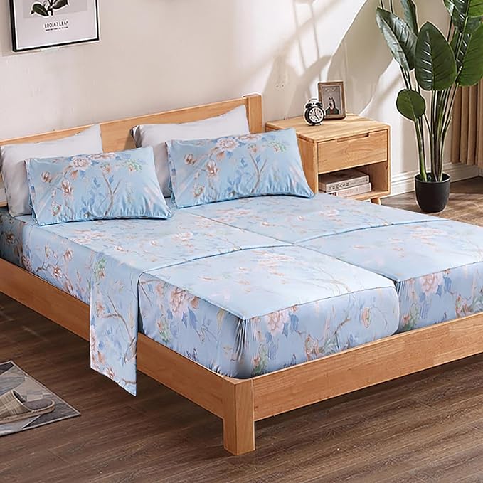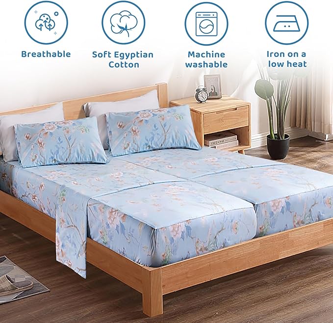 QSH 100% Cotton Floral Sheets for Split King Size Bed, Blue Flowers Plant Pattern Botanical Luxury Cotton Printed Floral Bedding Split King Sheet with Deep Pockets 17" Soft and Breathable 5pcs