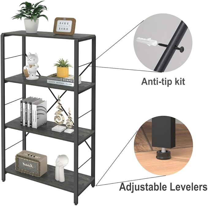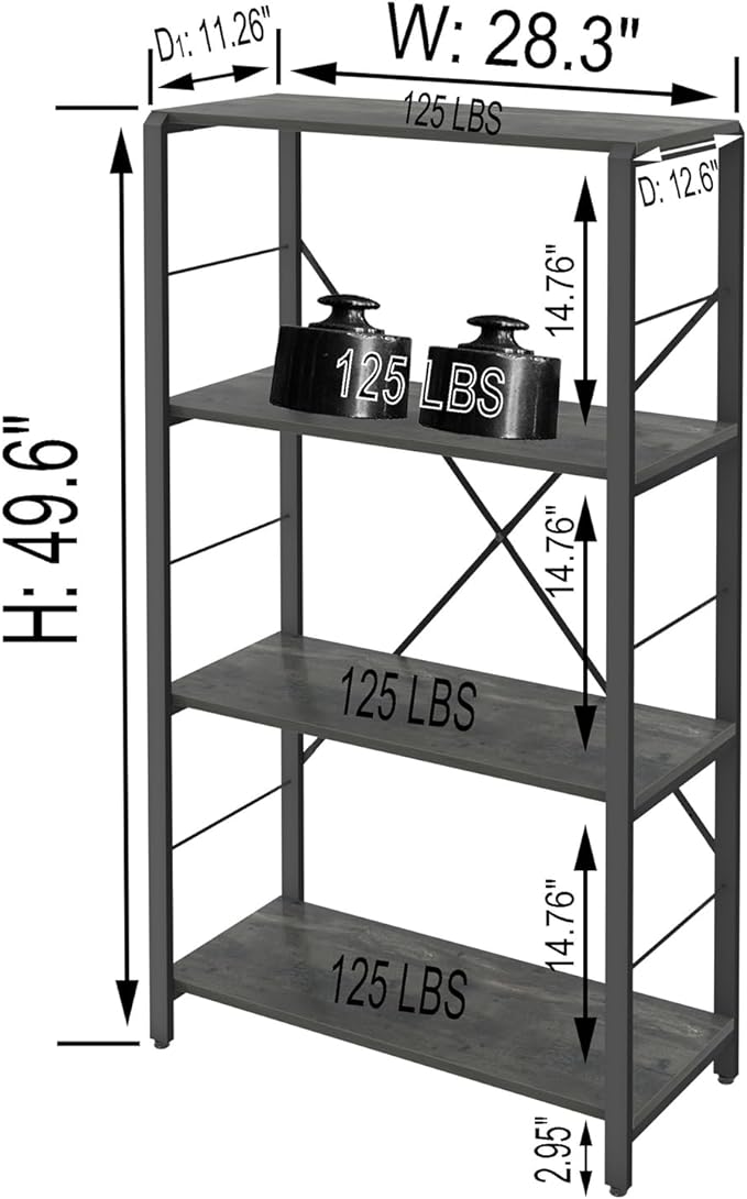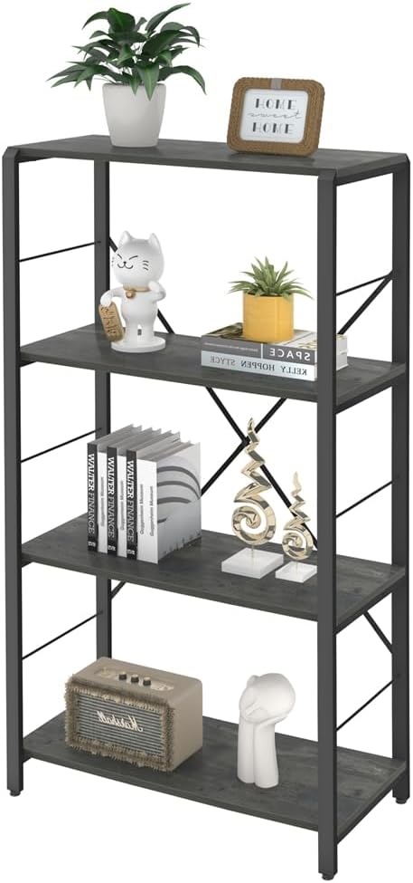 Bookshelf and Bookcase, Rustic Wood and Metal Book Shelves, Vintage 4-tier Shelving Unit for Living Room Bedroom, Grey