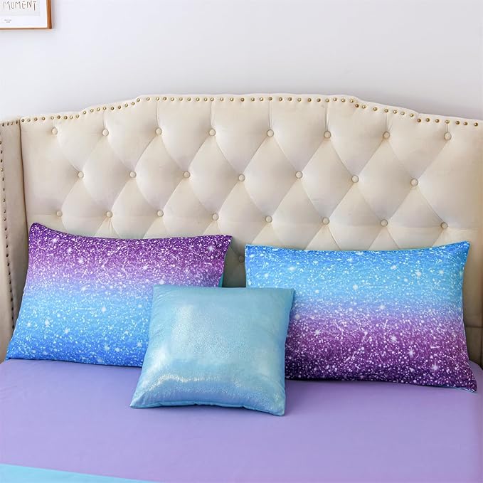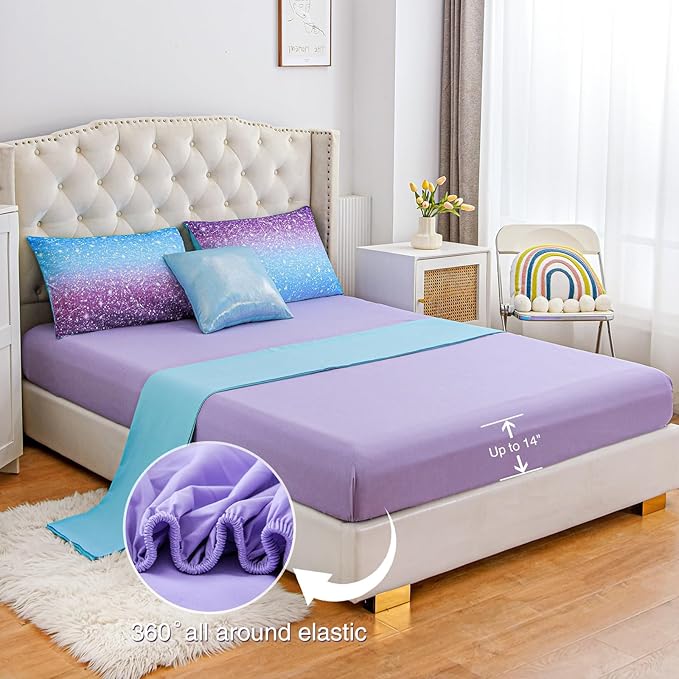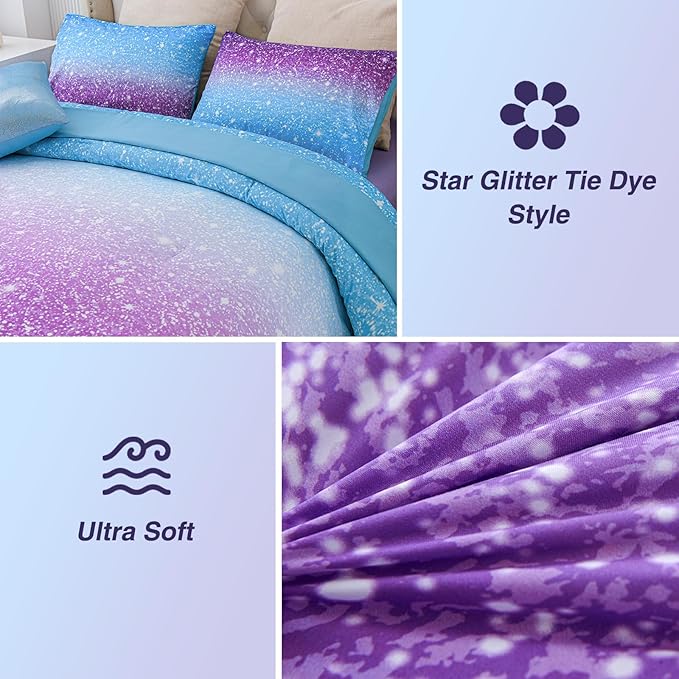 A Nice Night Girls Comforter Set Twin Size 6 Piece Bed in A Bag 3D Colorful Sparkle Galaxy Rainbow Bedding Comforter Sheet Sets for Kids,BluePurple