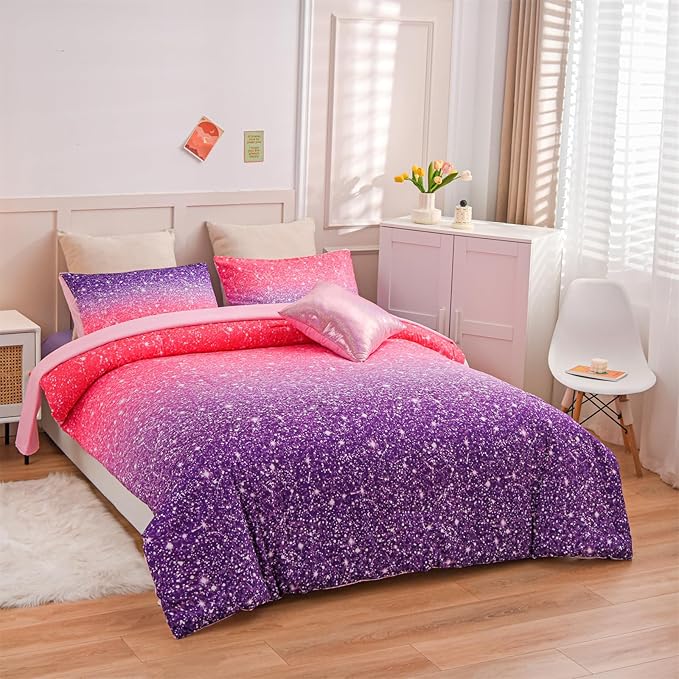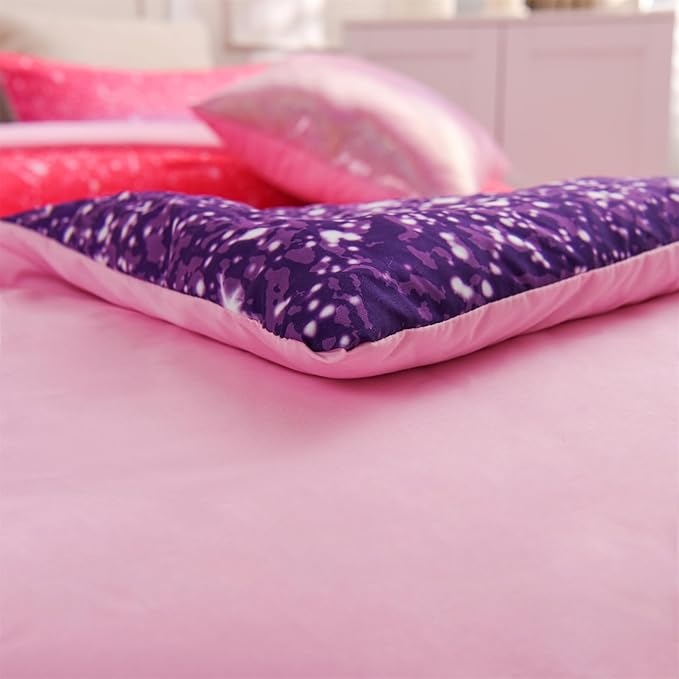 About This 【Design】Rainbow bedding comforter printed with the gradient pink purple glitter galaxy pattern, fantastic chic colors ombre mix with...