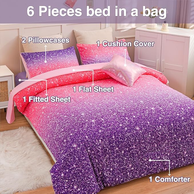 A Nice Night Girls Comforter Set Twin Size 6 Piece Bed in A Bag 3D Colorful Sparkle Galaxy Rainbow Bedding Comforter Sheet Sets for Kids,RedPurple