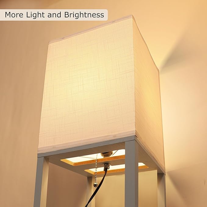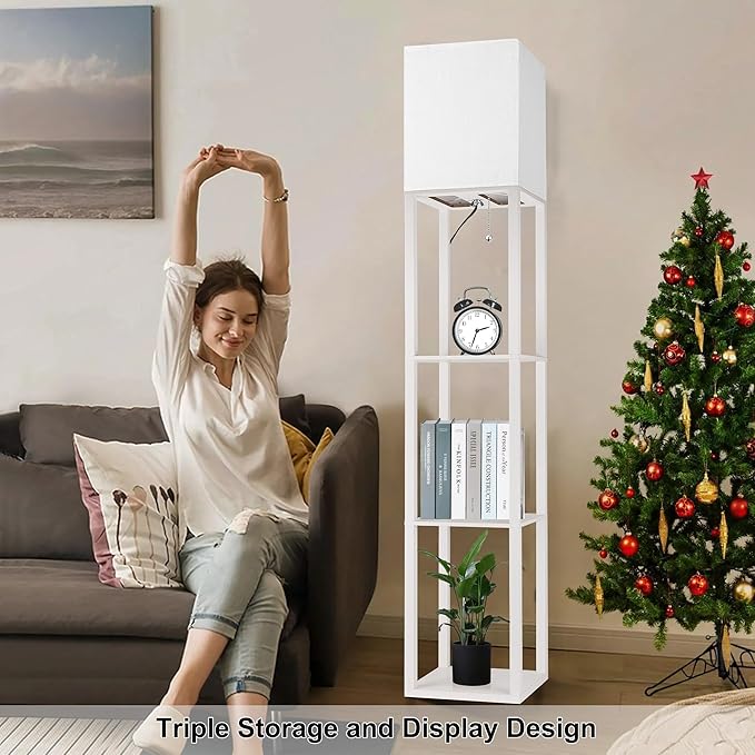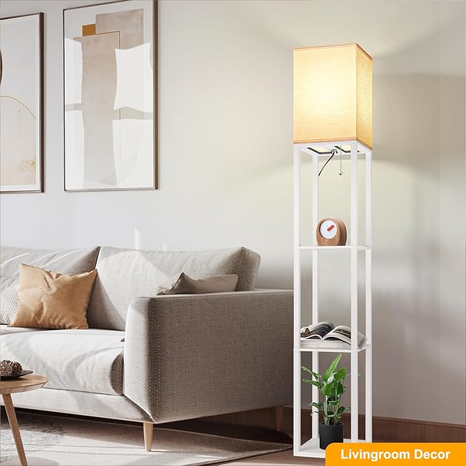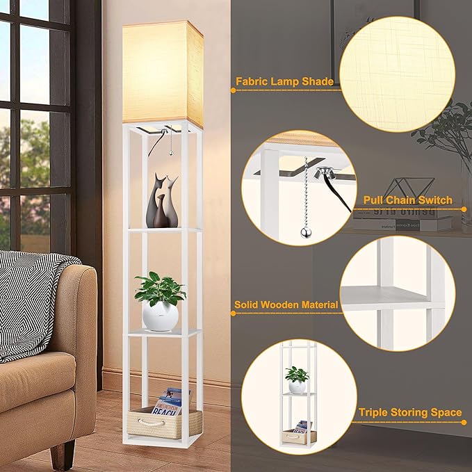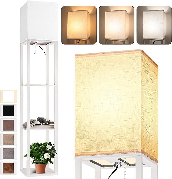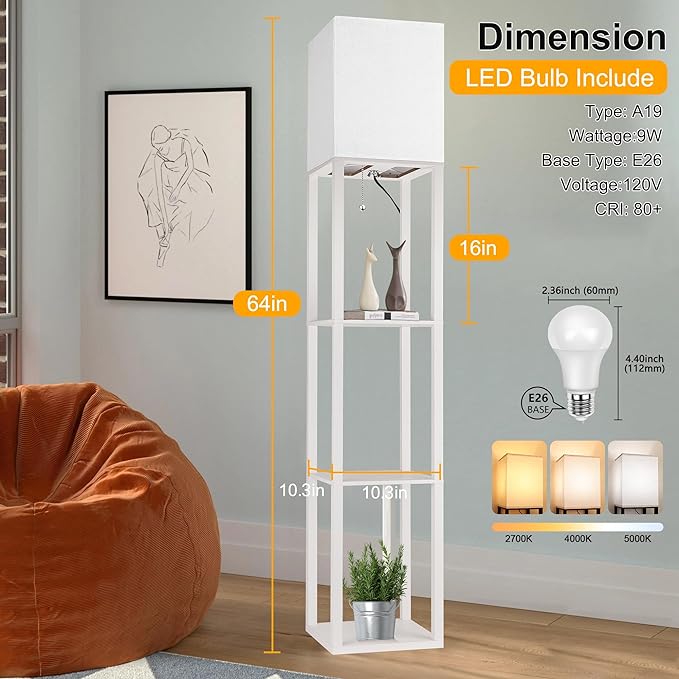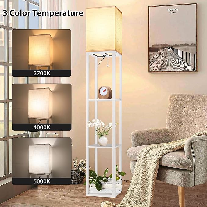Floor Lamp with Shelves for Living Room White, Shelf Floor Lamp with 3 CCT LED Bulb, Corner Display Standing Column Lamp Etagere Organizer Tower Nightstand with White Linen Shade for Bedroom, Office