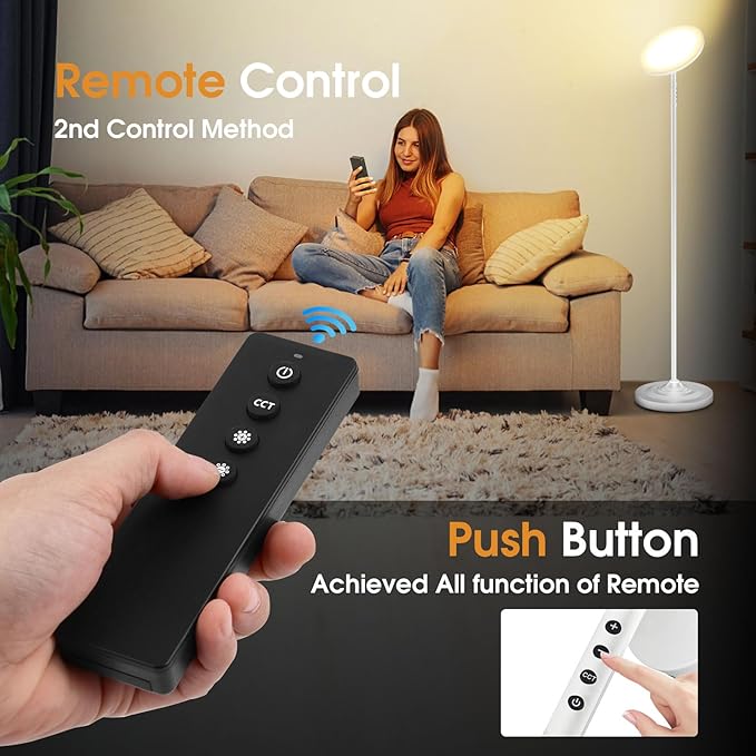 • 【Remote Control and Push Button】Specially more modern & high-tech designed perfect fit for wirelessly controlling the bright floor lamp. As its magnet designed, you can magnetise onto the lamp or any iron material furniture for easy finding. You can easily use remote to control the floor lamps without leaving the current position. Add push button on top of the light pole, which has all the functions of the remote control