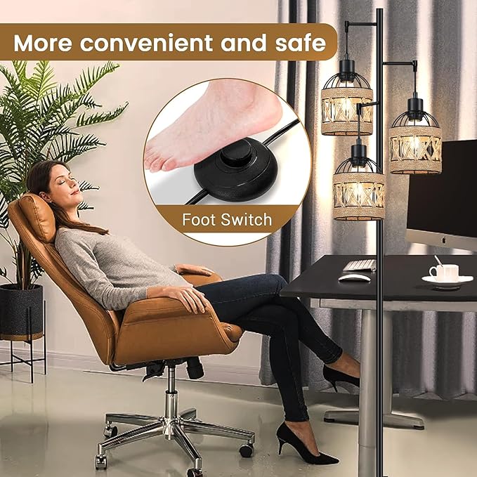 Tree Floor Lamp Rattan for Living Room,Bedroom,3-Lights Boho Floor Lamps,Farmhouse Industrial Black Standing Lamp Wicker Tall Lamp,Woven Bamboo Lamp Shade Floor Light Bohemian