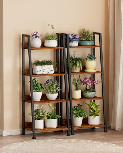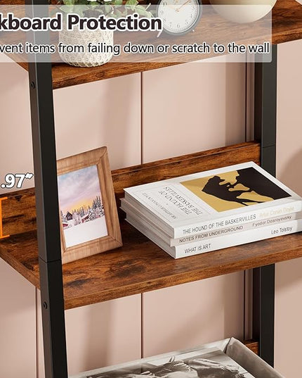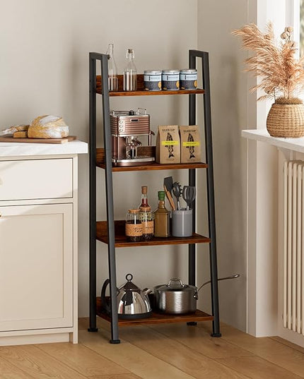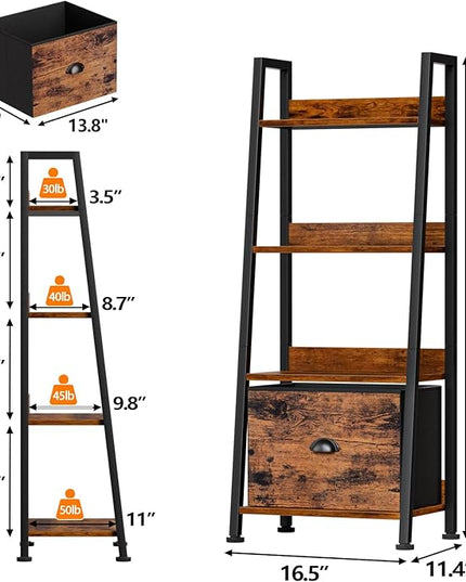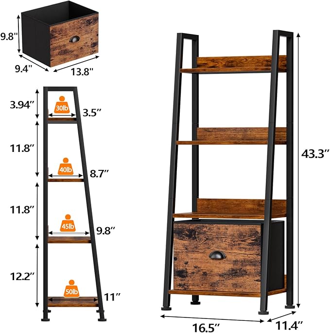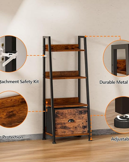 Furologee 4-Tier Ladder Shelf, Ladder Bookshelf with Removable Drawer, Rustic Bookcase Storage Rack Organizer, Wood Metal Freestanding Storage Shelves for Living Room, Home Office, Bedroom, Kitchen