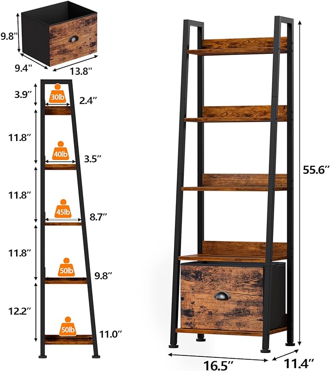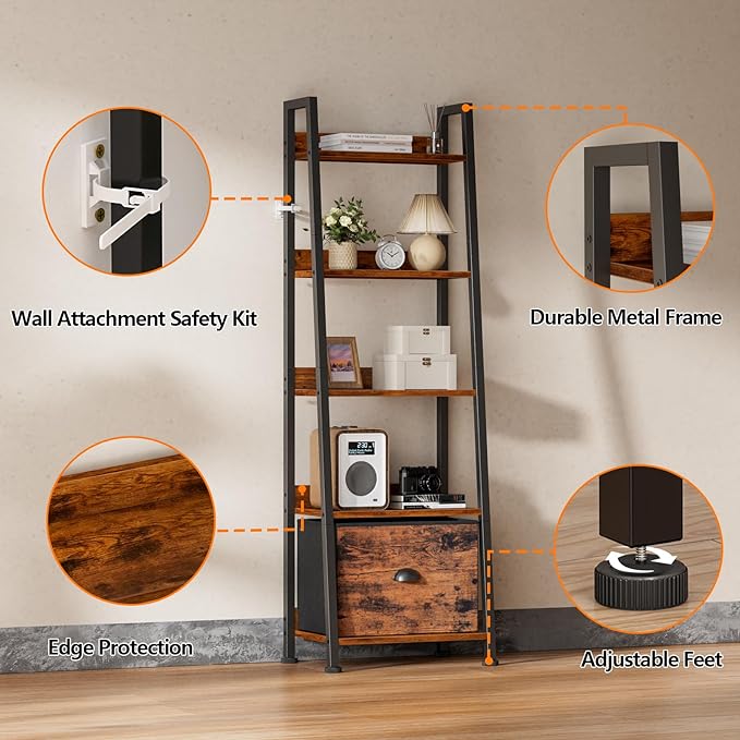 Furologee 5-Tier Ladder Shelf, Ladder Bookshelf with Removable Drawer, Rustic Bookcase Storage Rack Organizer, Wood Metal Freestanding Storage Shelf for Living Room, Home Office, Bedroom, Balcony