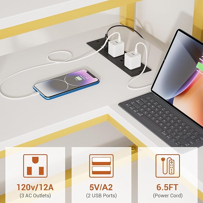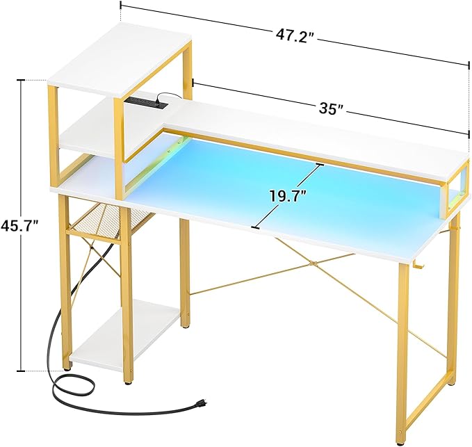 47" Gaming Desk with Storage, Computer Desk with LED Lights, Home Office Desk with Adjustable Shelves & Power Outlets, Gaming Computer Desk with Long Monitor Stand for Small Spaces, White Gold