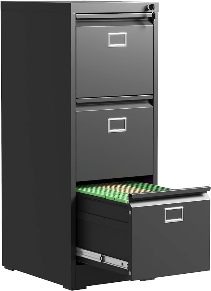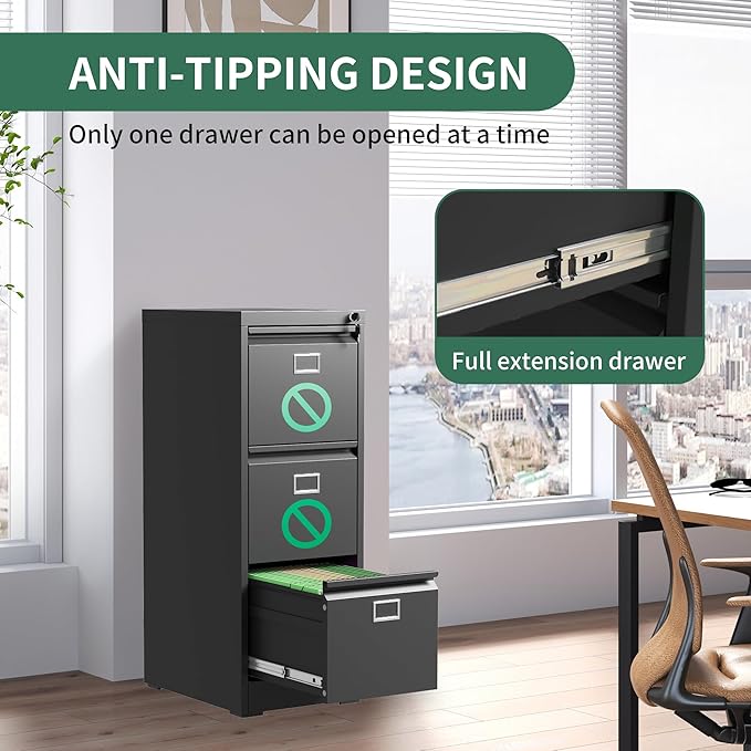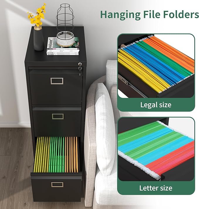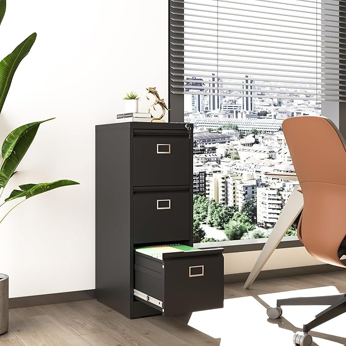 3 Drawer File Cabinet, Metal Vertical File Cabinets with Lock for Home Office, Office Steel Filing Cabinet for Hanging Files for A4/ Legal/Letter,Assembly Required (Black)
