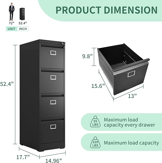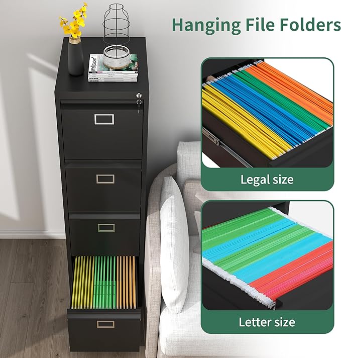 4 Drawer File Cabinet, Metal Vertical File Cabinets with Lock for Home Office, Heavy Duty Office Steel Filing Cabinet for Hanging Files for A4/ Legal/Letter,Assembly Required (Black)