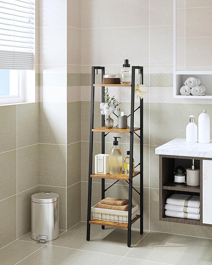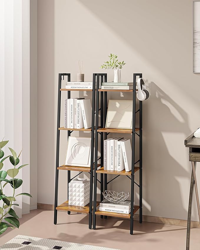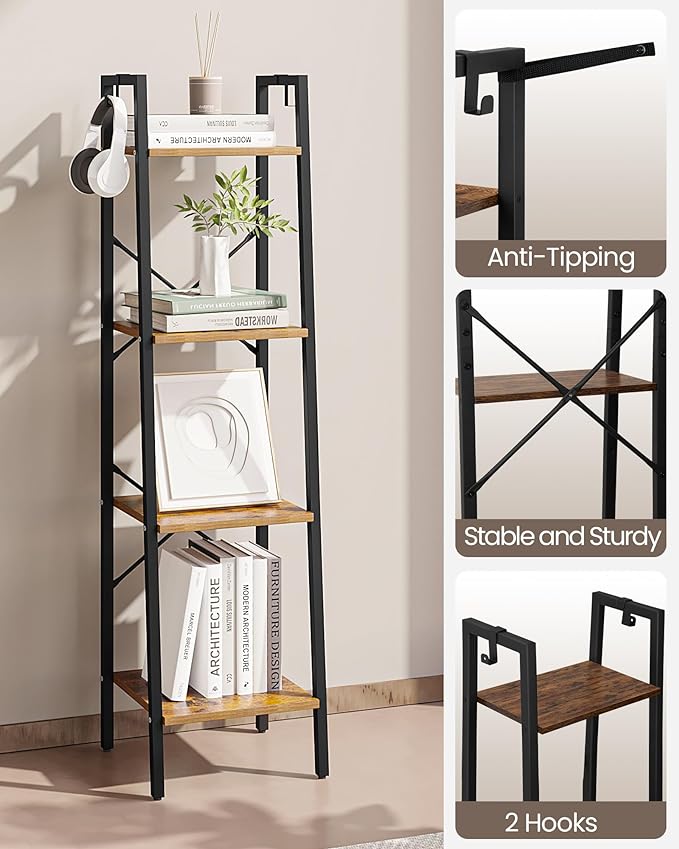 Ladder Shelf, Bookshelf Bookcase, Freestanding Corner Storage Shelve with 2 Hooks for Home Office, Living Room, Kitchen, Bedroom, Industrial, 4-Tier Rustic Brown BC13201B
