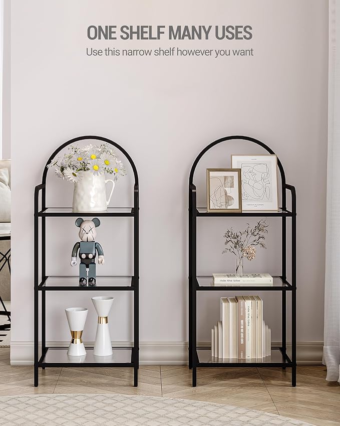 Bookcase Bookshelf, Tempered Glass Bookshelves, Slim Shelving Unit for Bedroom, Bathroom, Home Office, Steel Frame, 3 Tier Black BC10301B