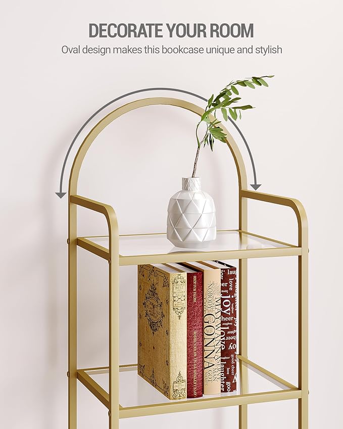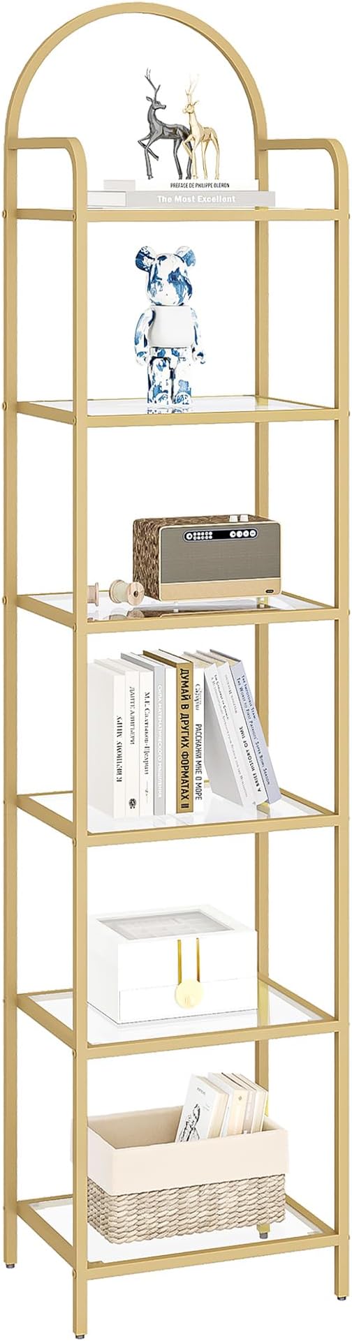 Bookcase Bookshelf, Tempered Glass Bookshelves, Slim Shelving Unit for Bedroom, Bathroom, Home Office, Steel Frame, 6 Tier Gold BC10601G
