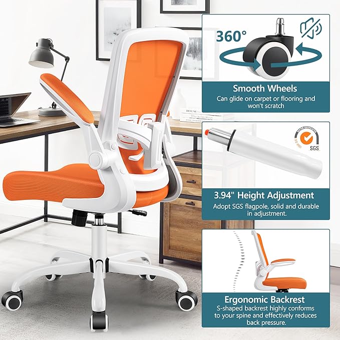 MINLOVE Office Chair Ergonomic Desk Chair with Adjustable Lumbar Support and Height, 90° Flip-up Armrests, Ergo Desk Chairs with Wheels, Home Work Use (Orange)
