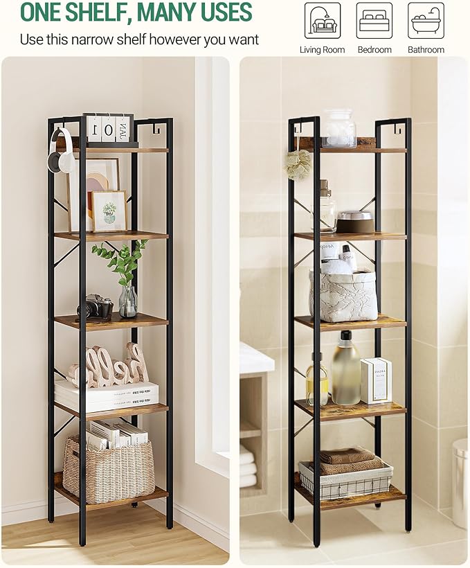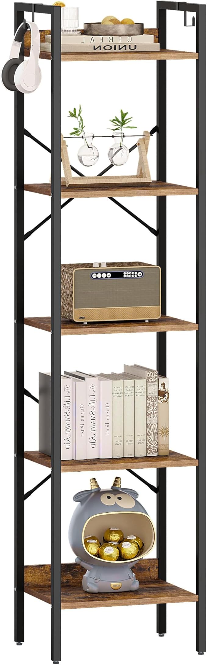 Bookshelf, Book Shelf, Industrial Bookcase with 2 Hooks, Coner Shelf Storage Organizer for Home Office, Living Room, Bedroom, Kitchen, 5-Tier Rustic Brown BC10501B