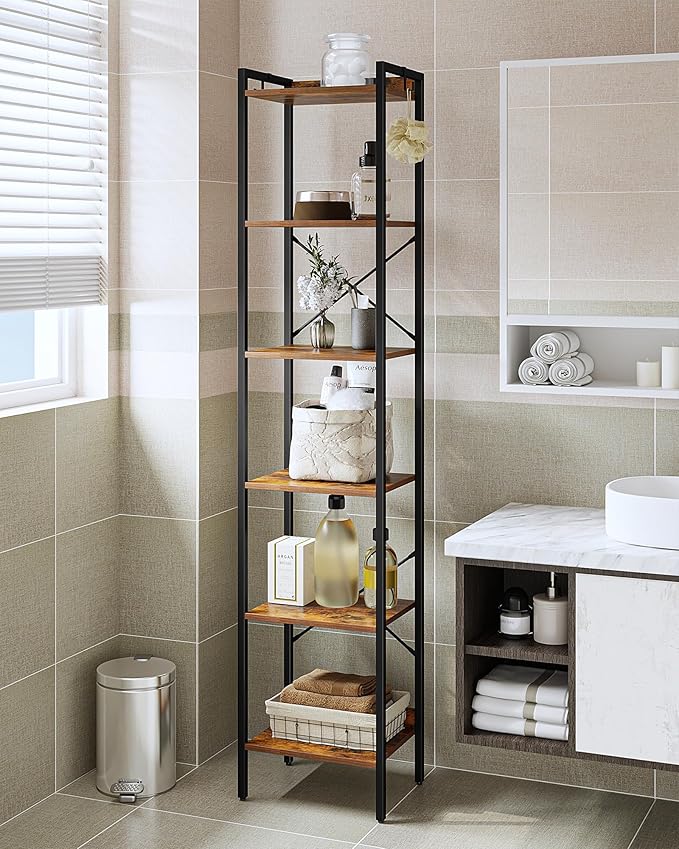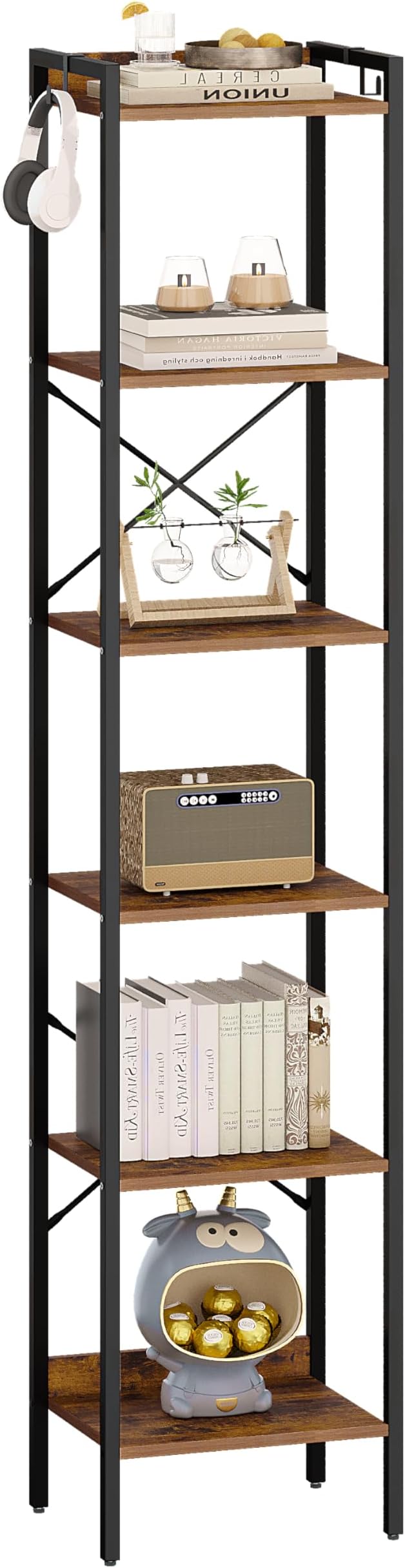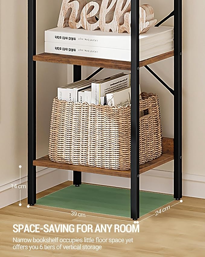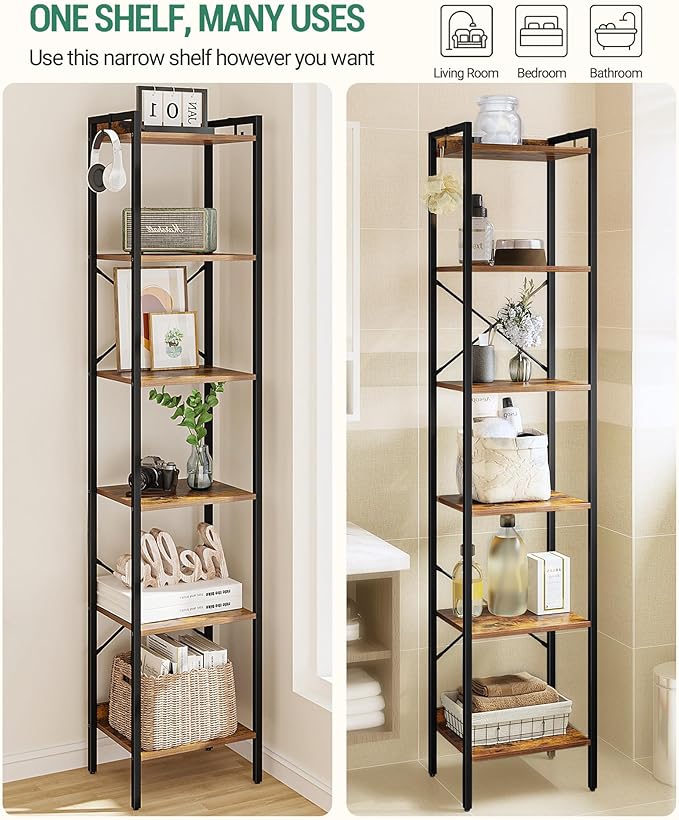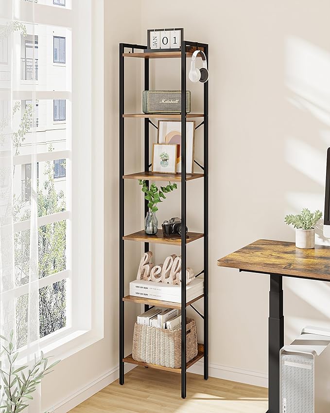 Bookshelf, Book Shelf, Industrial Bookcase with 2 Hooks, Coner Shelf Storage Organizer for Home Office, Living Room, Bedroom, Kitchen, 6-Tier Rustic Brown BC10701B