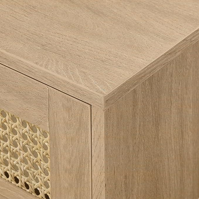 About This Modern, coastal aesthetic Made with warp-resistant MDF, durable laminate, and faux rattan Stylish finger-pull door openings Surface supports...