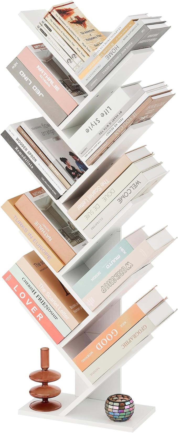 Hoctieon 10 Tier Tree Bookshelf, 10 Shelf Bookcase, Free Standing Tree Bookcase, Display Floor Standing Shelf for Books, Book Shelf Organizer, White
