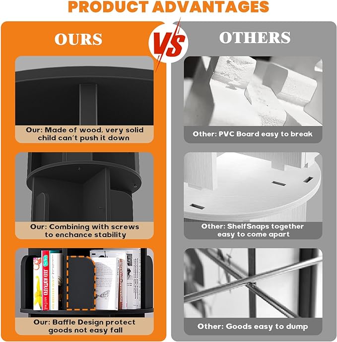Rotating Bookshelf, Wood Corner Bookshelf, 360 Display Spinning Bookcase Storage Rack, 4 Tier Floor Standing Revolving Bookcase Narrow Book Shelf Organizer for Small Space, Bedroom, Black