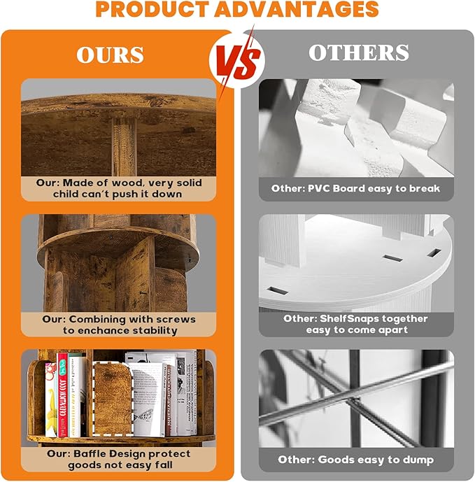 Rotating Bookshelf, Corner Bookshelf, 360 Display Wood Spinning Bookcase Storage Rack, Floor Standing Revolving Bookcase Narrow Book Shelf Organizer for Small Space, Bedroom, Rustic Brown