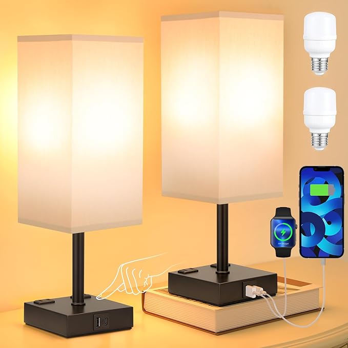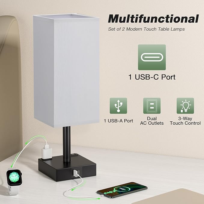 aooshine Black Base Gray Shade Set of 2 Touch Lamp with USB Port-Nightstand Lamp with USB-C+A Charge Ports& AC Outlets, 3-Way Dimmable Bedside Lamp, Small Table Lamp for Bedroom (Bulbs Included)